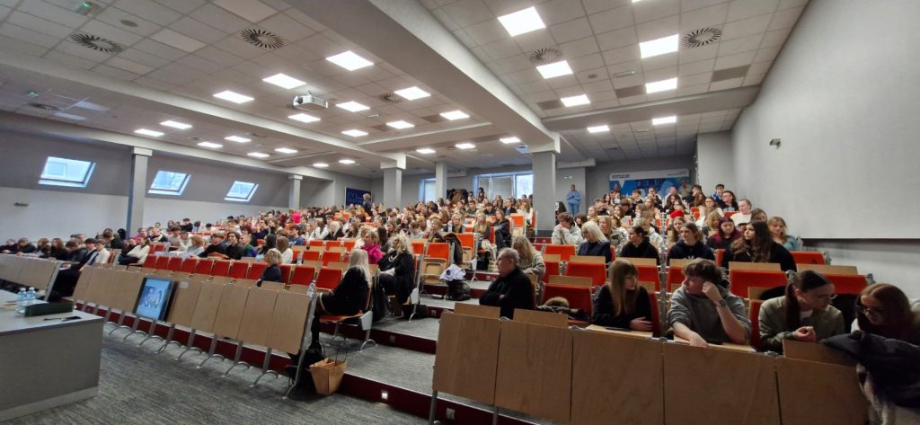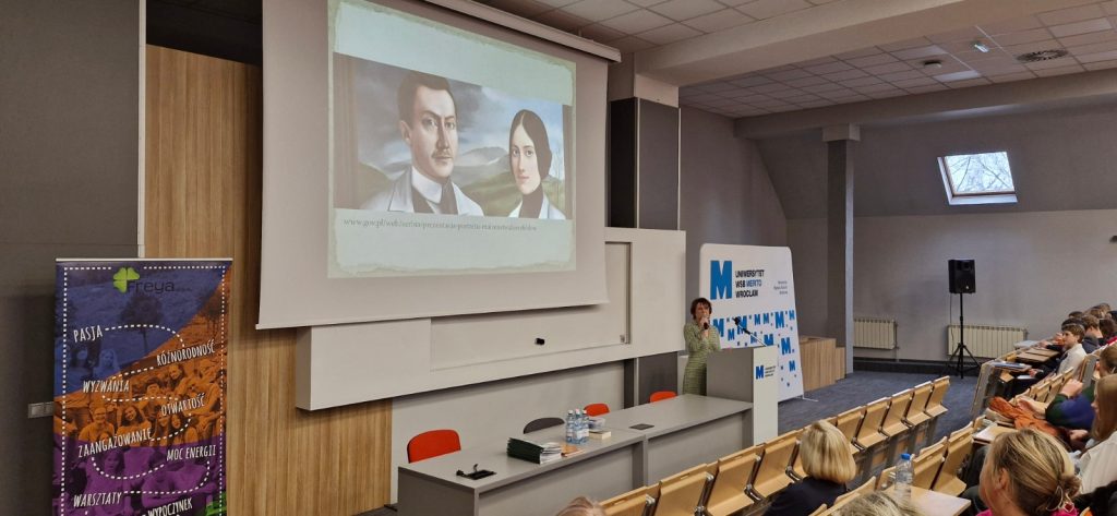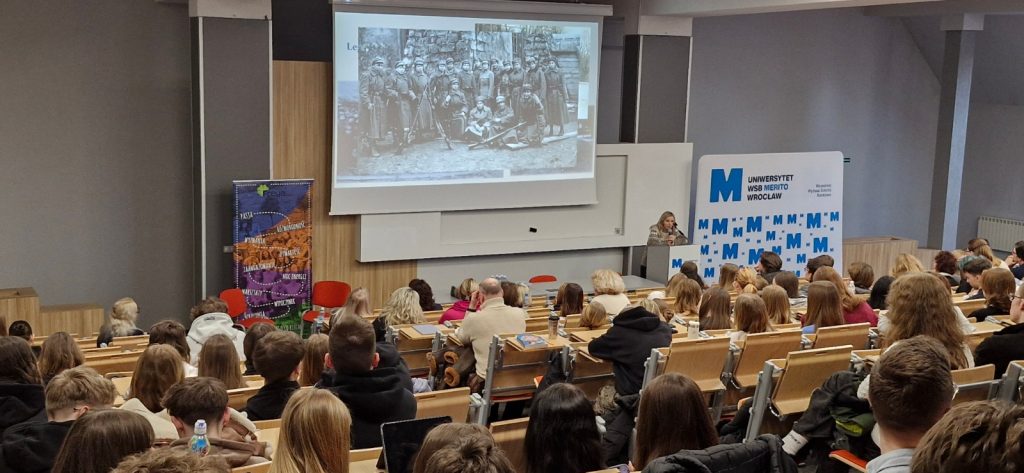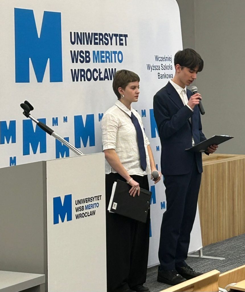 18.02.2026 r. w auli Uniwersytetu WSB Merito we Wrocławiu odbyła się konferencja zorganizowana przez Wrocławską Fundację Edukacji Europejskiej i Współpracy Międzynarodowej Freya oraz Stowarzyszenie Amicis in Educatione, reprezentowane przez Magdalenę Piróg, Jolantę Różanowską i Edytę Reinhard. Udział w niej wzięło 320 uczniów szkół ponadpodstawowych z Wrocławia (ZS nr 1, LO I, III, IV, V, VI, VII, VIII, XV) oraz LO Cogito ze Zgorzelca i IV LO z Wałbrzycha. Naszą szkolę reprezentowali przedstawiciele klas 1f, 3a, 3DP1, 3DP2 i 3DP4, a w rolach konferansjerów znakomicie sprawdzili się Karolina Kędziora i Ksawery Czapski z kl. 3a.