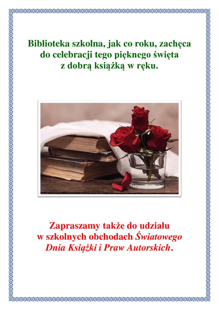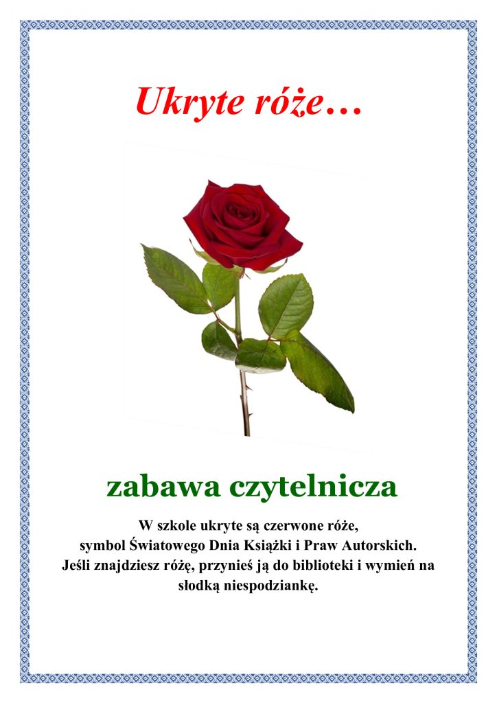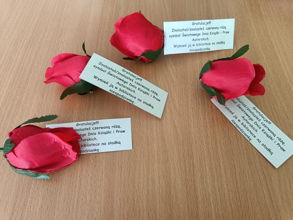 Na terenie szkoły ukryte są czerwone róże – symbol Światowego Dnia Książki i Praw Autorskich. Znajdź różę, przynieś ją do biblioteki i wymień na słodką niespodziankę!