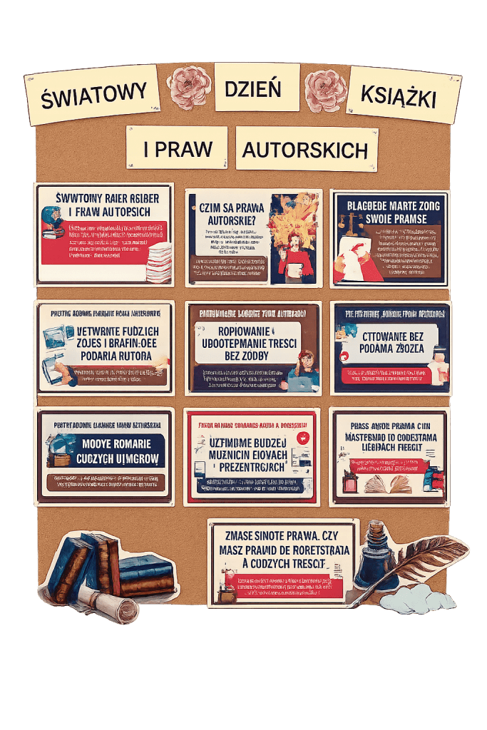 Serdecznie zapraszamy uczniów do udziału w obchodach Światowego Dnia Książki i Praw Autorskich. Z tej okazji przygotowaliśmy szereg wydarzeń promujących czytelnictwo oraz poszerzających wiedzę na temat literatury i prawa autorskiego.